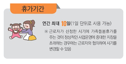 - 가족 돌봄 휴가는 단기간(연 최대 10일, 자녀 돌봄의 경우 최대 20일) 휴가가 가능하도록 설정돼 있어요.